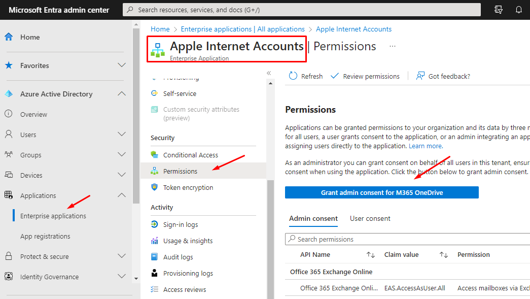 Bunun için Azure Active Directory (Entra) yönetim merkezine oturum açın. Uygulamalar>>Kurumsal Uygulamalar menüsüne giriş yapın. Burada Apple veya Ios accounts yazarak arama yapın. Karşınıza Apple Internet Accounts veya IOS Internet Accounts adında bir uygulama çıkacaktır. Sonrasında uygulamanın içerisine giriş yapın. Aşağıda gördüğünüz gibi Permissions/ İzinler menüsünden “Grant Admin consent for Organization Name” seçeneğini kullanarak Apple/IOS internet accounts için tüm tenanta izin tanımlayabilirsiniz.