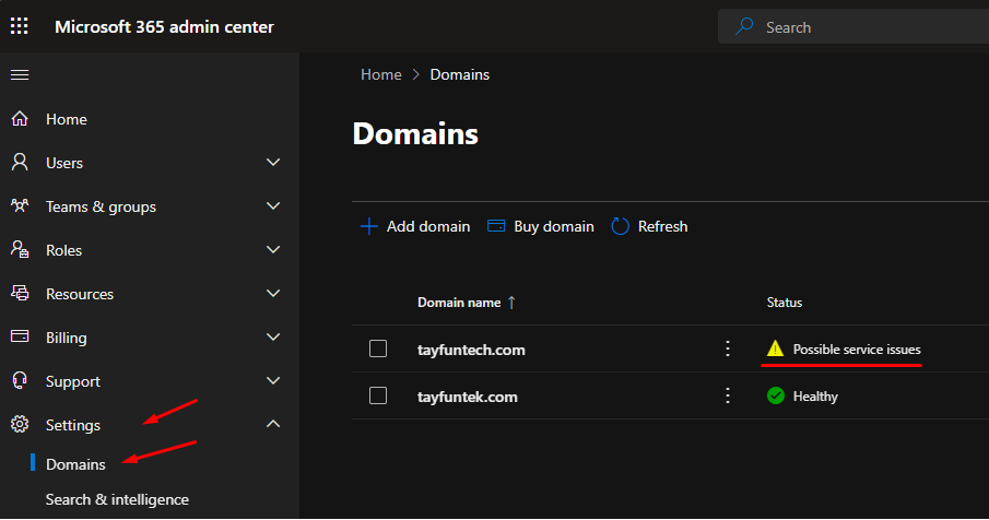 - Use 365 Admin Center: If you’re using Microsoft 365, log in to the Admin Center, go to “Settings” select “Domains” and then click on the domain you want to check. You should be able to Look for any warnings or errors related to DNS records, especially MX records. This will help you pinpoint the issue.