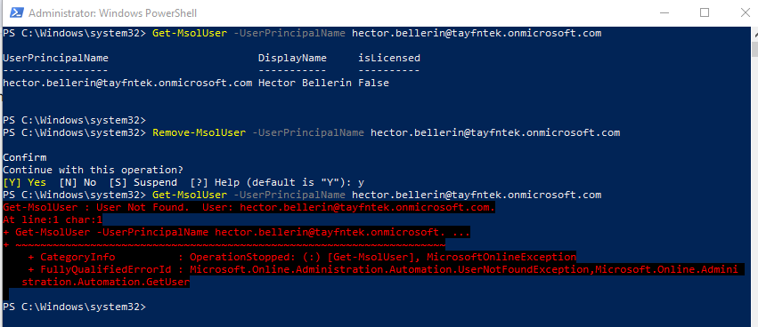 Remove-MsolUser -UserPrincipalName hector.bellerin@tayfntek.onmicrosoft.com