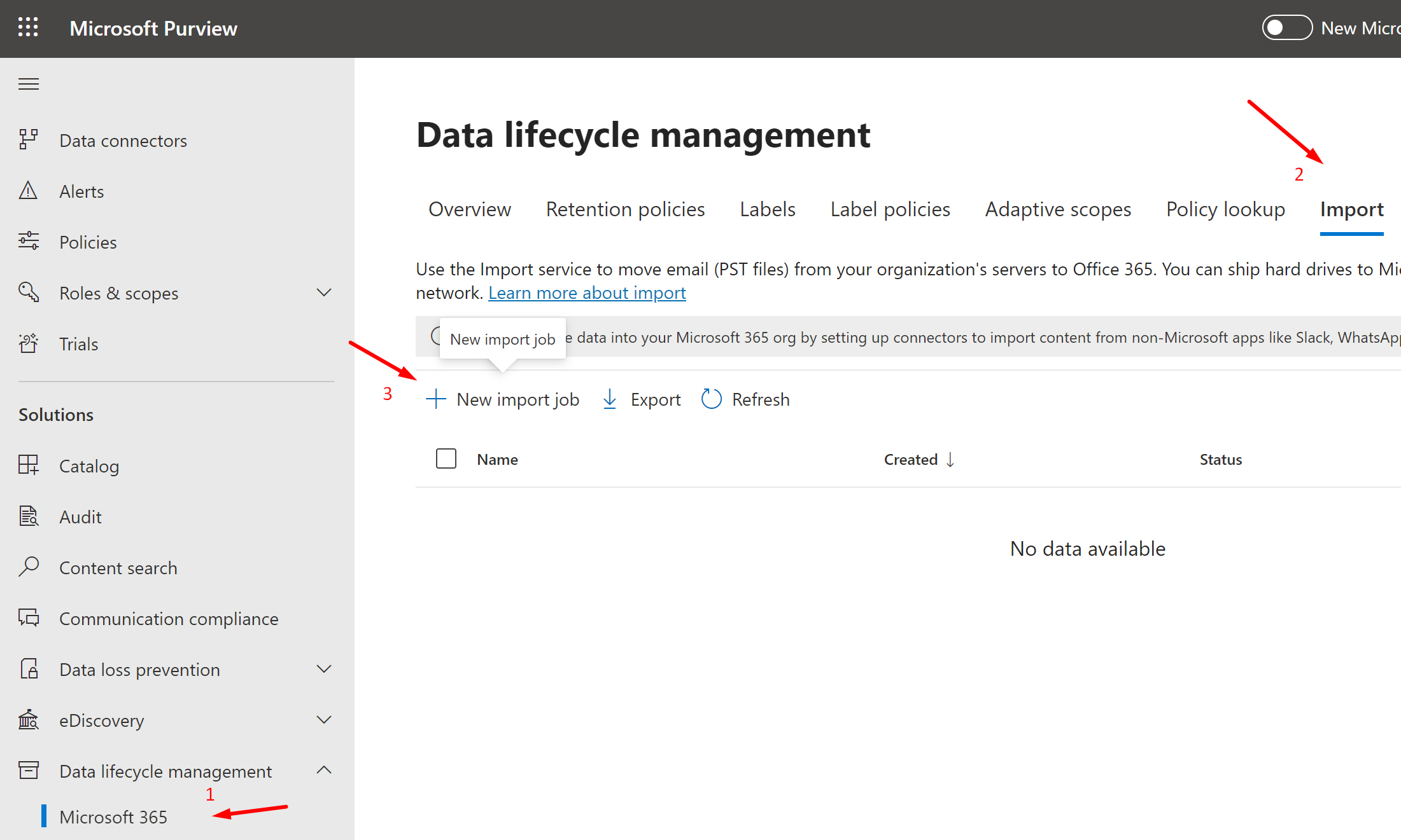 Öncelikle https://compliance.microsoft.com/ adresinden Uyumluluk menüsüne giriş yapın. Sonrasında Veri Yaşam Döngüsü Yönetimi>>Microsoft 365 menülerini takip edin. Burada İçeri Aktar seçeneğini kullanın.