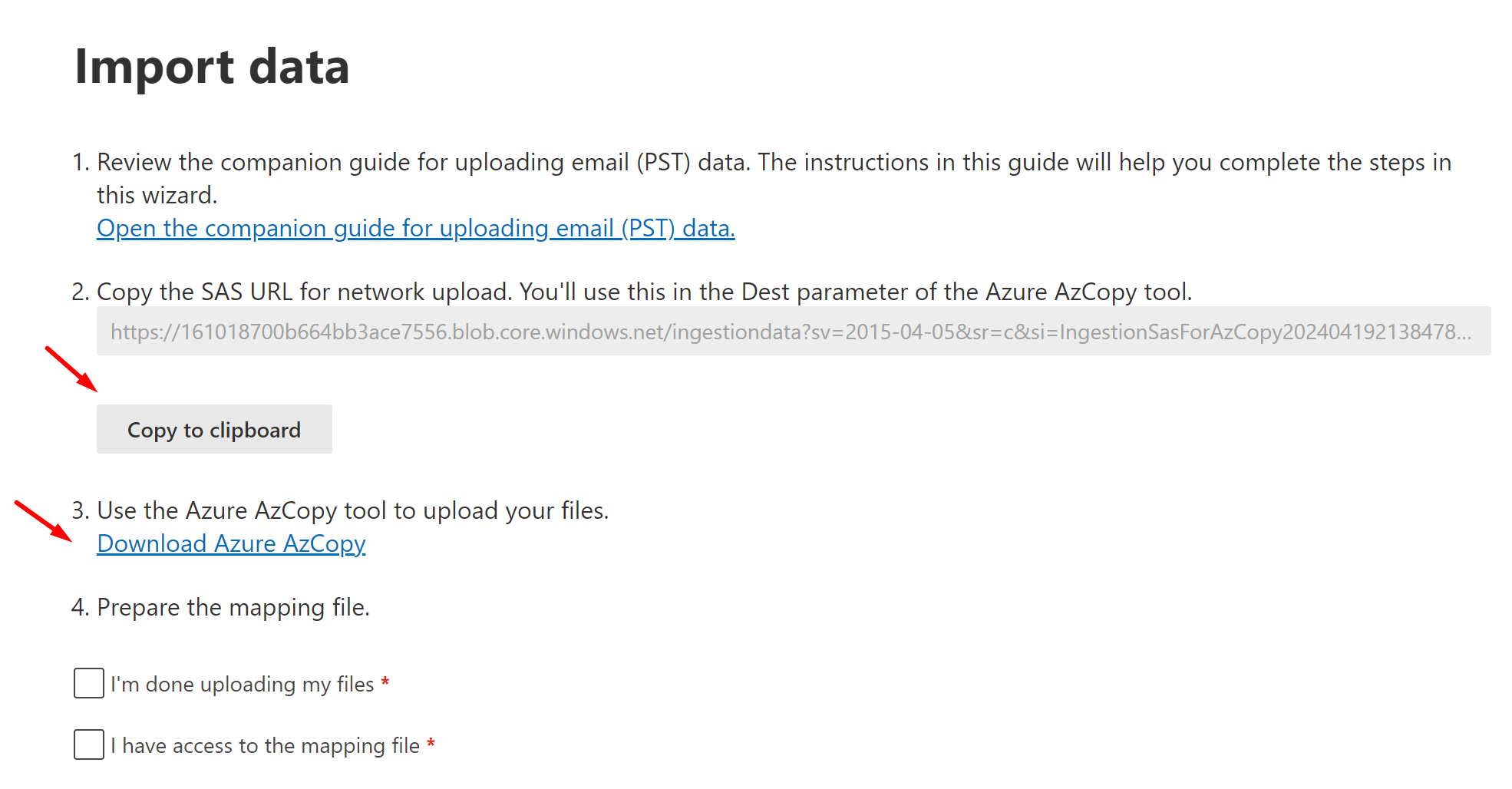 Bu bölümde Microsoft’un bize PST dosyalarını yüklemek için verdiği Azure Blob storage için bir erişim URL’I oluşturacağız. Oluşturulan bu URL’I kopyalayıp not alın. Ardından Download Azure AZCopy linkine tıklayıp Azcopy programını bilgisayarınıza indirin.