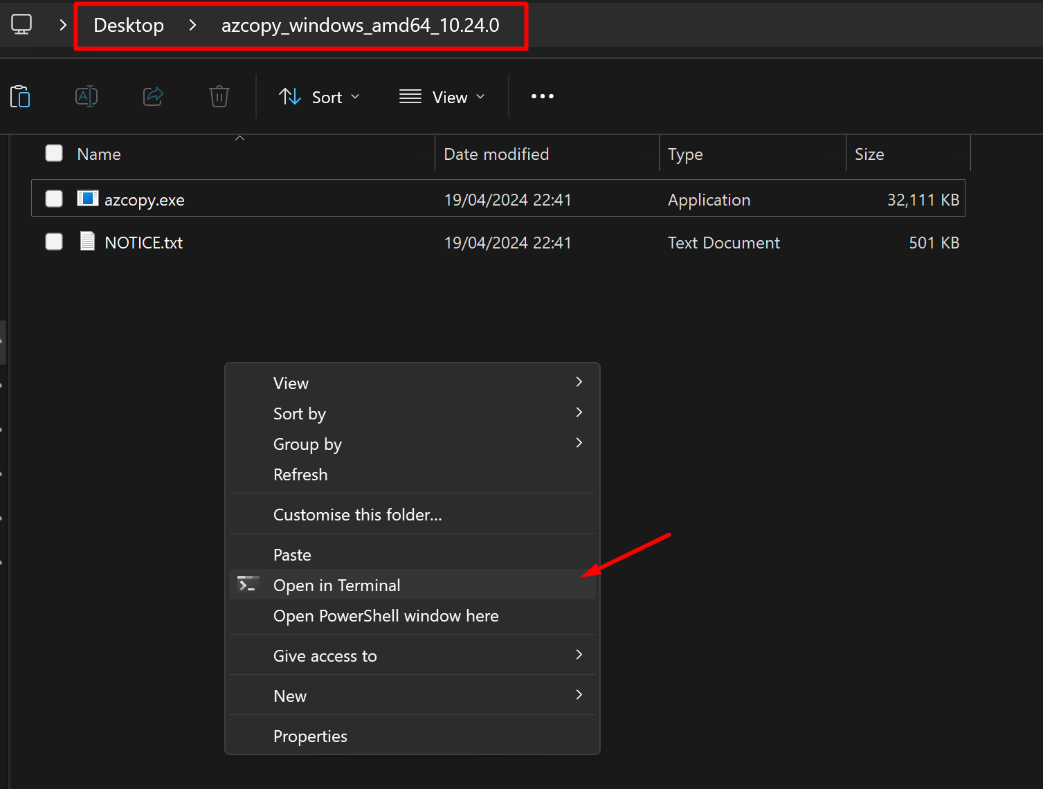 Uygun Azcopy versiyonunu bilgisayara indirdikten sonra programın bulunduğu directory’e giderek komut satırını çalıştırın.