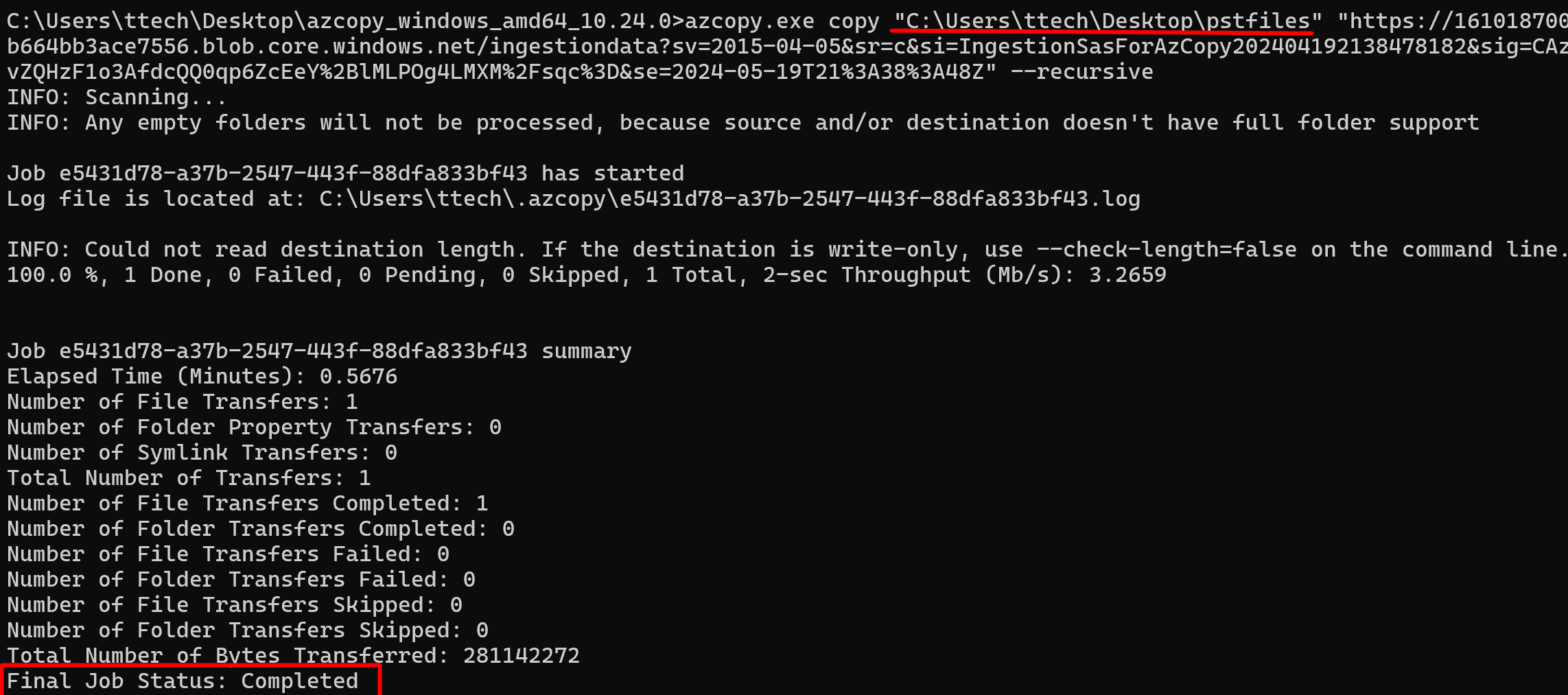 azcopy.exe copy "\\FILESERVER1\PSTs" "https://3c3e5952a2764023ad14984.blob.core.windows.net/ingestiondata?sv=2012-02-12&se=9999-12-31T23%3A59%3A59Z&sr=c&si=IngestionSasForAzCopy201601121920498117&sig=Vt5S4hVzlzMcBkuH8bH711atBffdrOS72TlV1mNdORg%3D" --recursive
