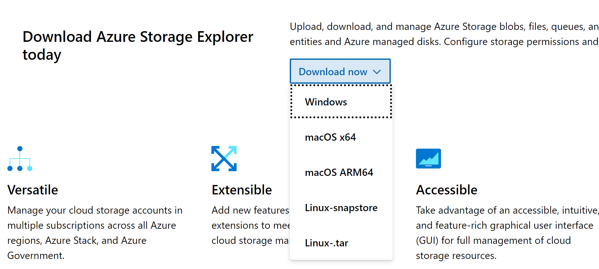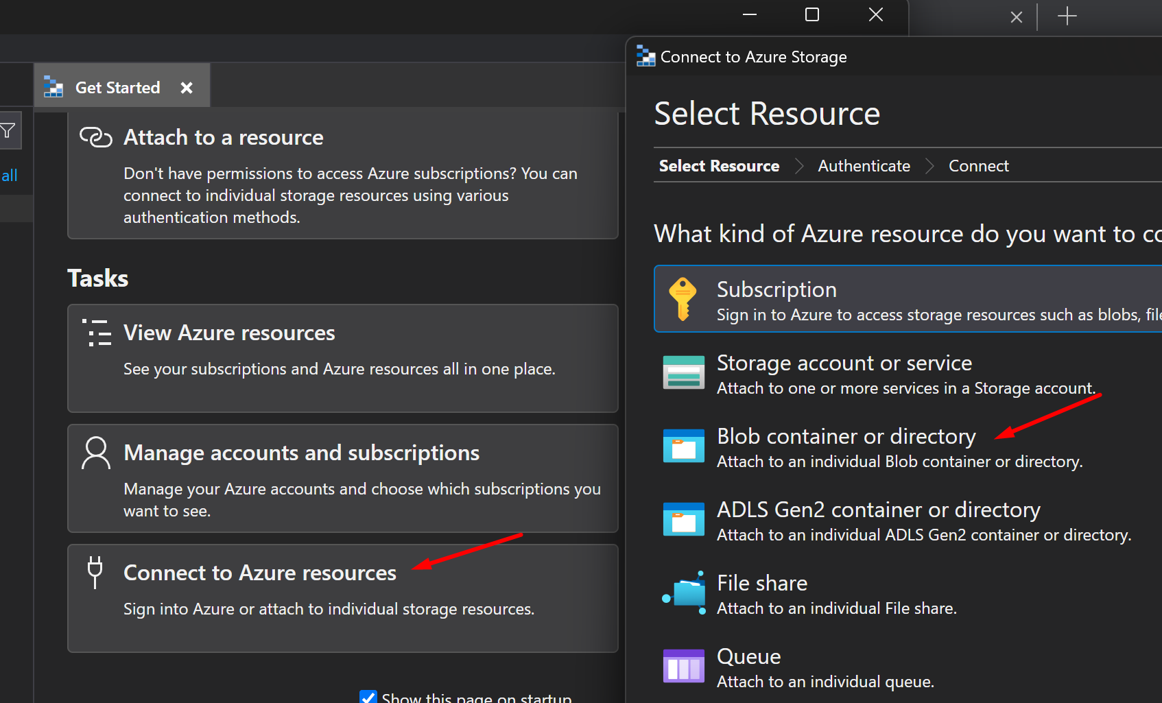 İndirip kurduğum Azure Storage Explorer uygulamasında sırasıyla Connect to Azure Resources>>Blob Container or directory seçenelerini takip ediyorum.