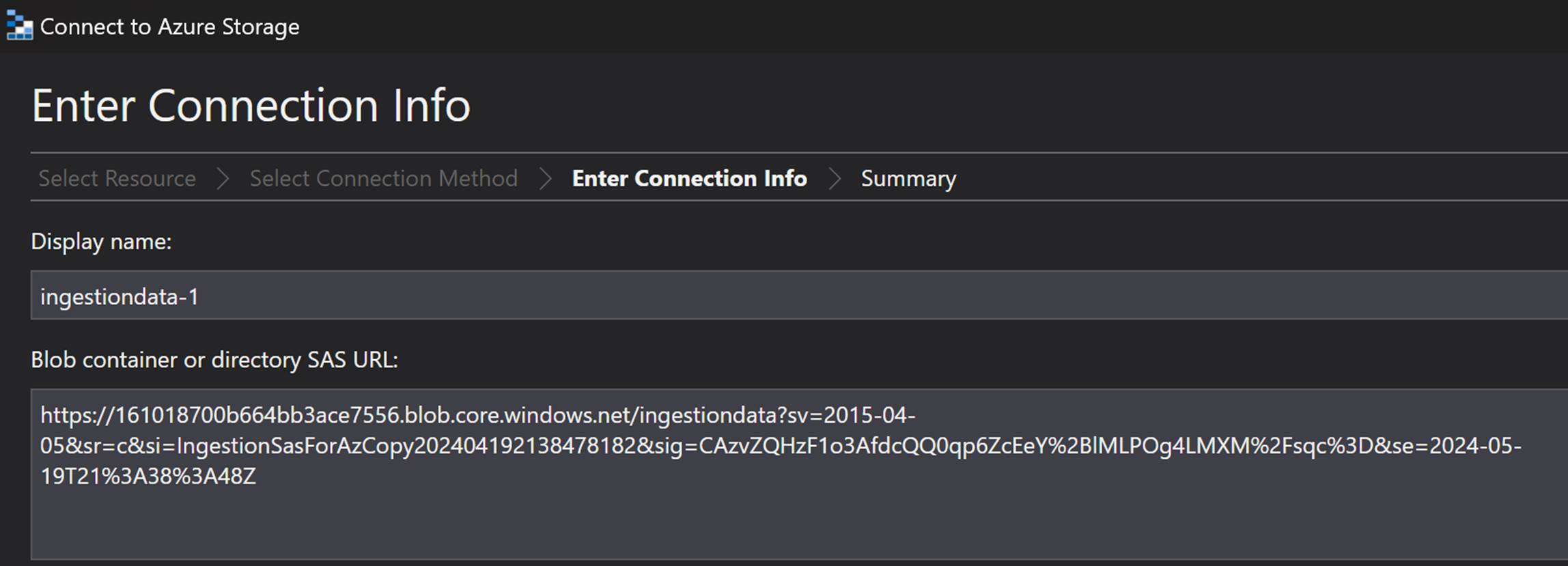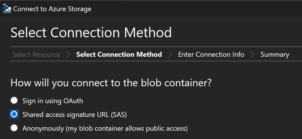 Ardından Shared Access Signature seçeneğini seçip SAS URL’I yapıştırarak bağlantı sağlıyorum.