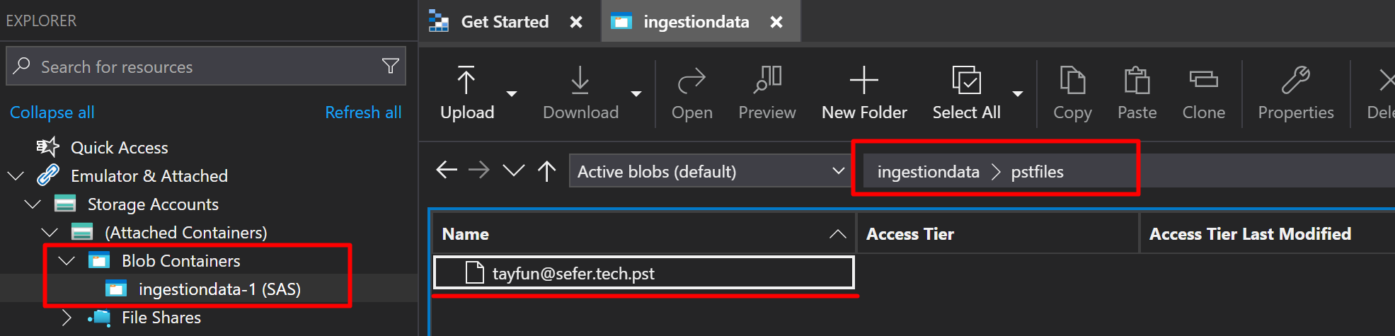 Aşağıda gördüğünüz gibi Azure Blob Storage’a yüklediğim PST dosyası ve lokasyonunu teyit edebiliyorum.