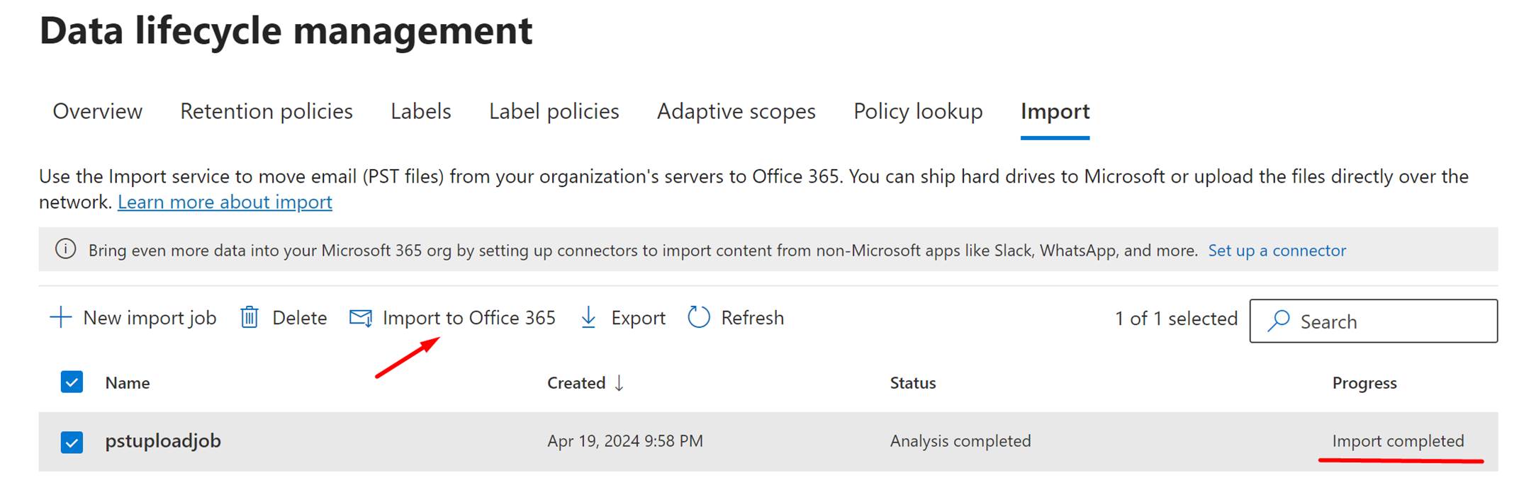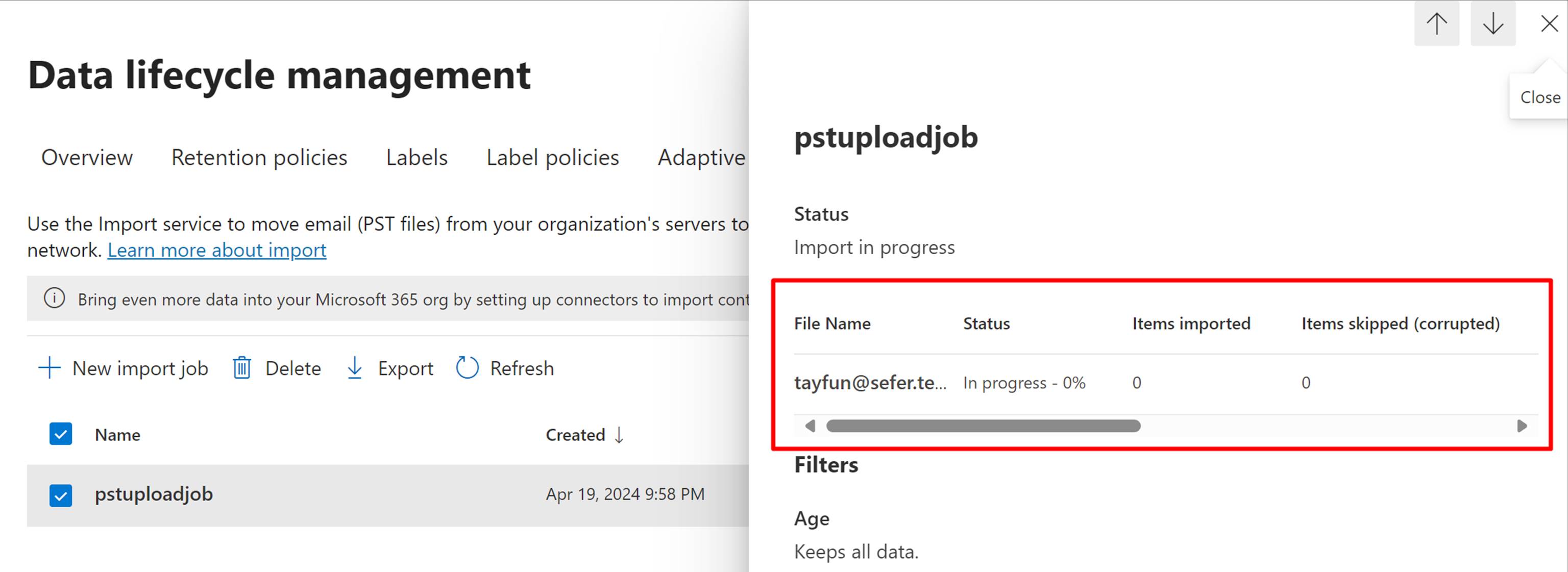 Artık geriye sadece başlattığımız işi takip etmek kalıyor. Emailler boyuya ve öğe sayısına göre değişmekle birlikte hızlı bir şekilde hedef posta kutusuna import edilecektir.